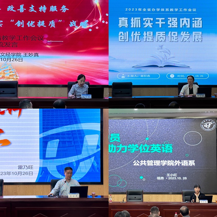 随后,文经学院院长王妙真介绍了学院的各项办学实践结果,强调要在深化教学改革中改善支持服务,落实“创优提质”战略。公管学院院长谢程燕提出要聚焦主责主业、狠抓工作落实,深化“1312”班主任工作模式。理工学院院长雷乃旺紧扣“新工科、新农科、新理工“的发展方向,表示要加强协同,形成工作合力,强化过程监督,优化管理机制。公共管理学院外语系主任王小红展示了学位英语工作成果,并提出了新要求和新期盼。