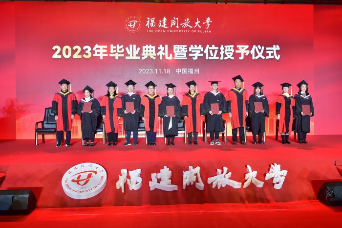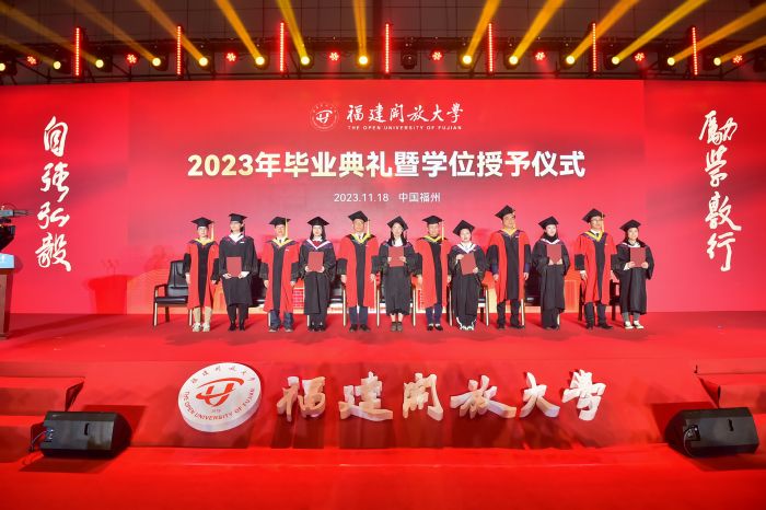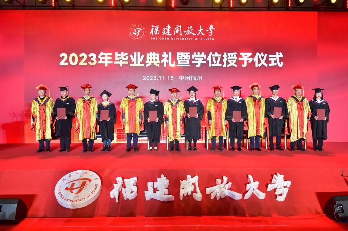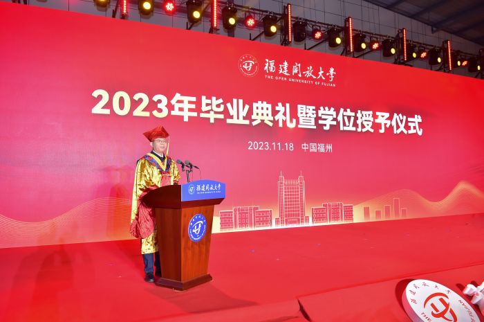 11月18日下午,福建开放大学2023年毕业典礼暨学位授予仪式在桂山校区体育馆举行。校党委书记陈兴炎、校长吴国荣、校党委副书记马成斌、副校长沈光辉、纪委书记王幼新、副校长吴建铭、副校长李正光出席典礼,国家开放大学学位评定委员会委员,全省办学体系导师代表,相关部门、学院负责人,获得学位的毕业生及其他毕业生代表300多人参加了主会场活动。毕业典礼以主分会场、线上线下互联互通的方式举行。全省万名师生通过观看直播,共同见证这一重要时刻。典礼由副校长李正光教授主持。