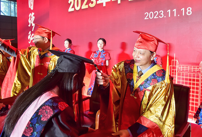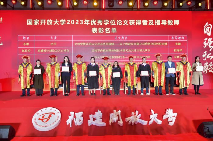 毕业生们伴着欢快的音乐整齐步入体育馆,在庄严的国歌声中,典礼正式拉开帷幕。马成斌宣读了2022年优秀毕业生名单。李正光宣读了2023年优秀学位论文获得者及指导教师名单、2023年毕业生和学位获得者名单。校领导为主会场优秀毕业生代表、获评优秀学位论文的学生及指导教师颁发荣誉证书,校领导、国开学位评定委员会委员和全省办学体系导师代表共同为毕业生代表颁发学士学位证书并授学士礼。