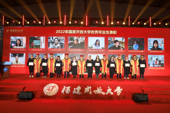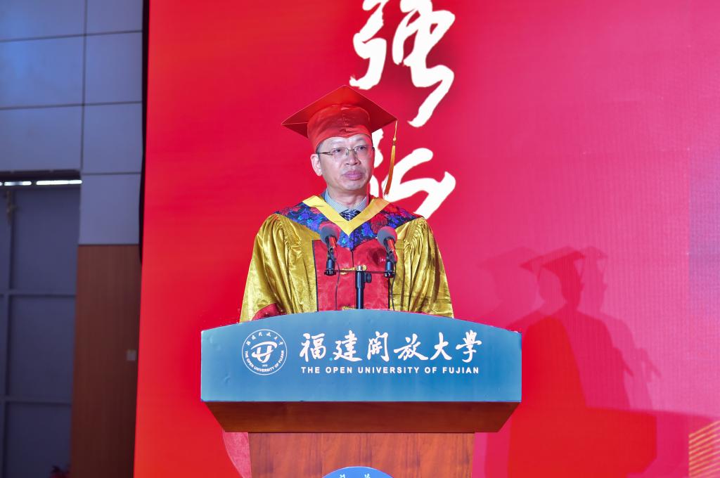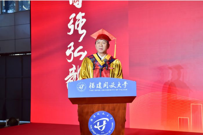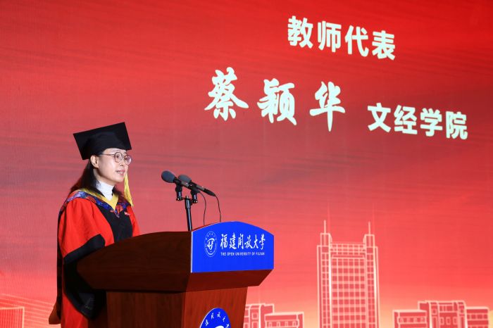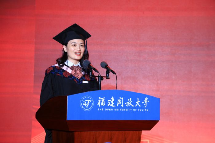 蔡颖华副教授作为教师代表发言,她为毕业生们送上祝福和期盼,希望同学们时刻牢记校训“自强弘毅、励学敦行”,将福建开大精神薪火相传。漳州开放大学工商管理本科专业毕业生吕燕雅作为优秀毕业生代表发言。她表示将不负母校的培养、不负老师的教诲、不负自己的努力,利用所学的知识技能去探索人生的广度和深度,在自己的领域发光发热。典礼在全体人员共同合唱《福建开放大学校歌》中圆满结束。