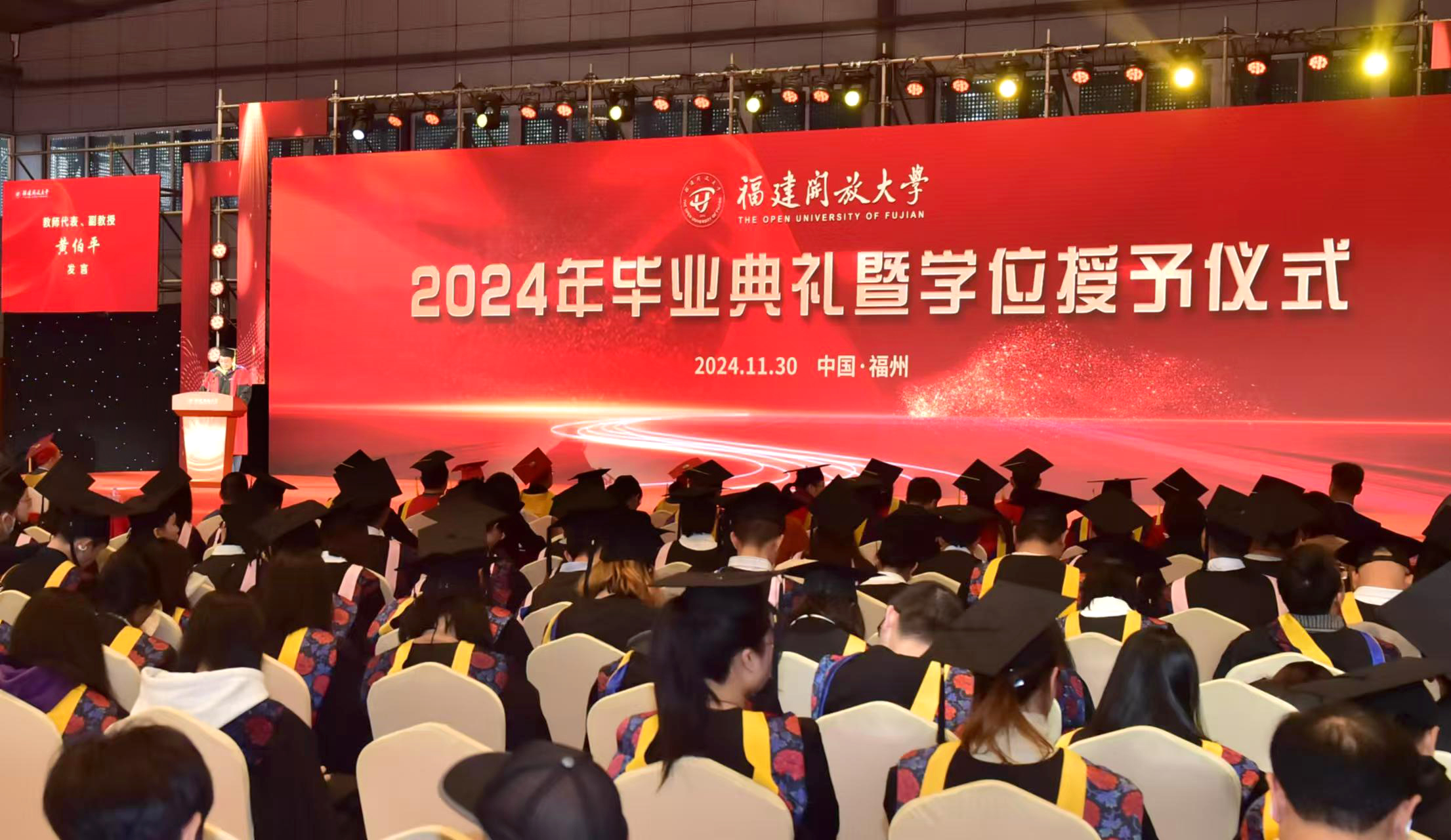 11月30日下午,福建开放大学2024年毕业典礼暨学位授予仪式在桂山校区体育馆举行。校党委书记庄莉、校党委副书记马成斌、副校长吴建铭、副校长李正光、纪委书记李琳出席典礼,国家开放大学学位评定委员会委员,全省办学体系导师代表,相关部门、学院负责人,获得学位的毕业生及其他毕业生代表300多人参加了主会场活动。毕业典礼以主分会场、线上线下互联互通的方式举行。全省万名师生通过观看直播,共同见证这一重要时刻。典礼由李正光教授主持。