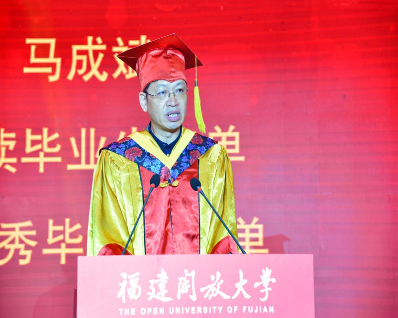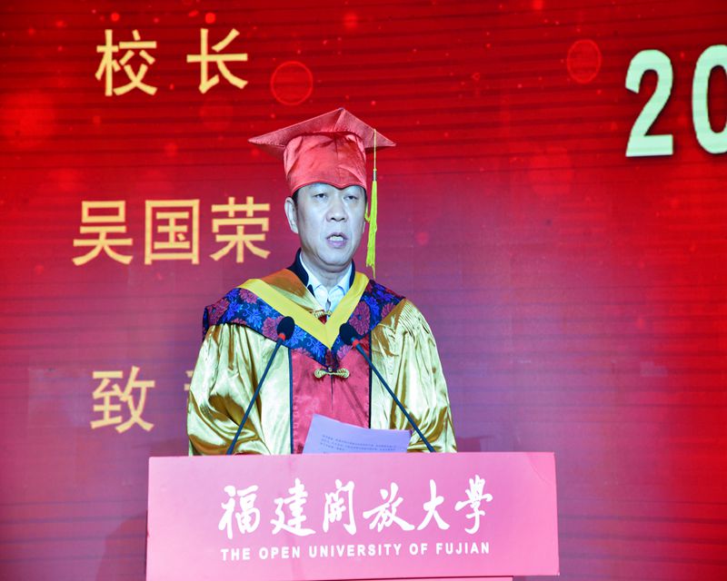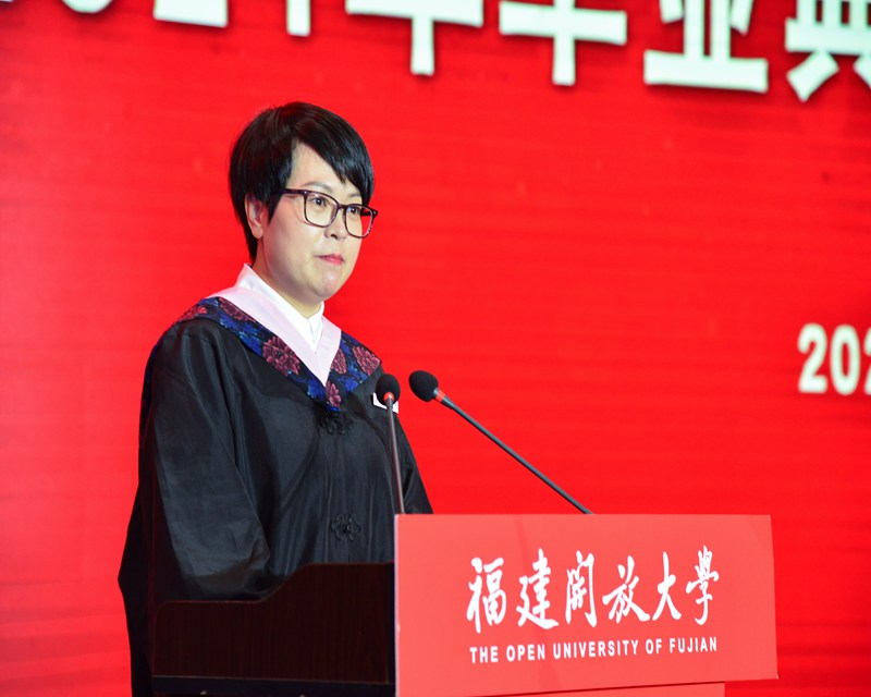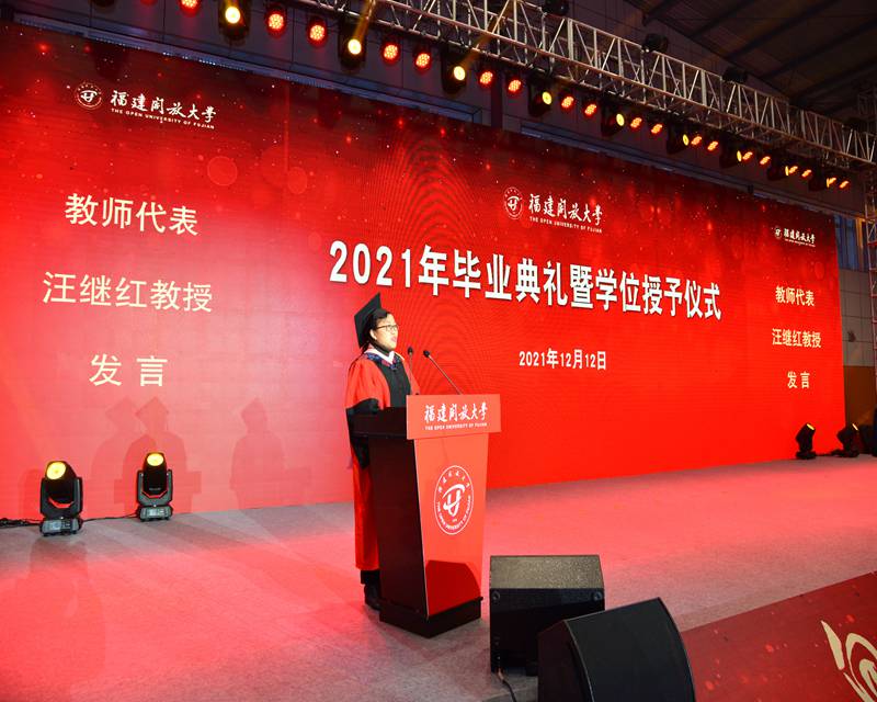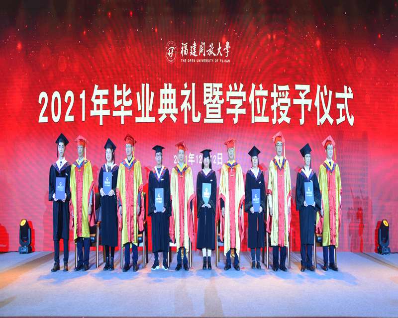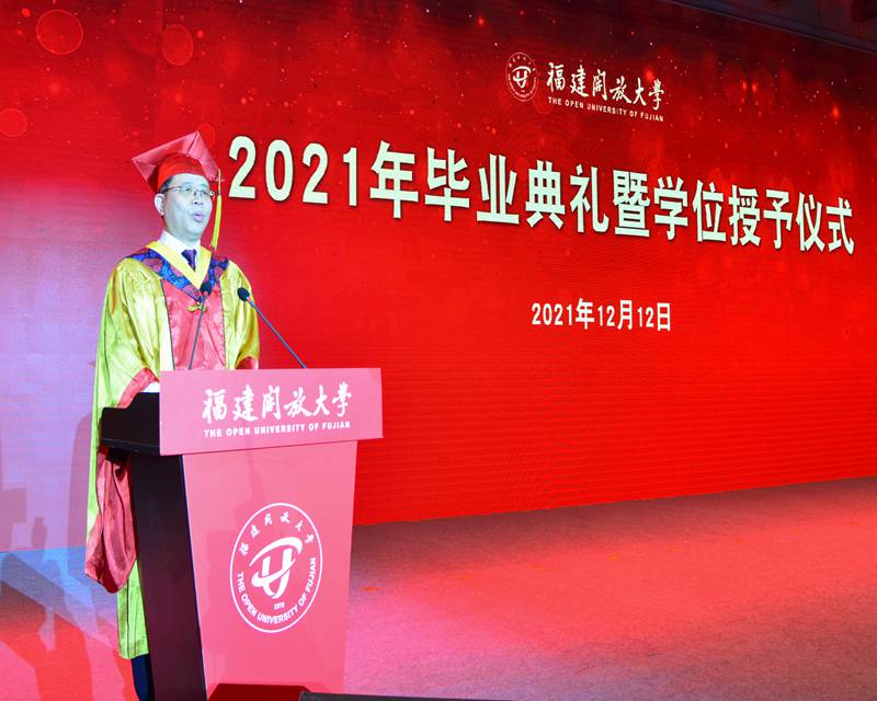 12月12日上午,福建开放大学2021年毕业典礼暨学位授予仪式在桂山校区体育馆举行,党委书记陈兴炎、校长吴国荣、副书记马成斌、副校长沈光辉、纪委书记王幼新、副校长李正光出席典礼,国开学位评定委员会委员,全省开放大学系统教授代表,相关部门、学院负责人,获得学位的毕业生及其他毕业生代表300多人参加了主会场现场毕业典礼活动。毕业典礼以线下精心呈现、线上同步直播的形式举行。全省万名师生和家长校友在主会场、分会场及通过网上视频直播等方式参加了别开生面的“云毕业典礼”。李正光主持毕业典礼。
