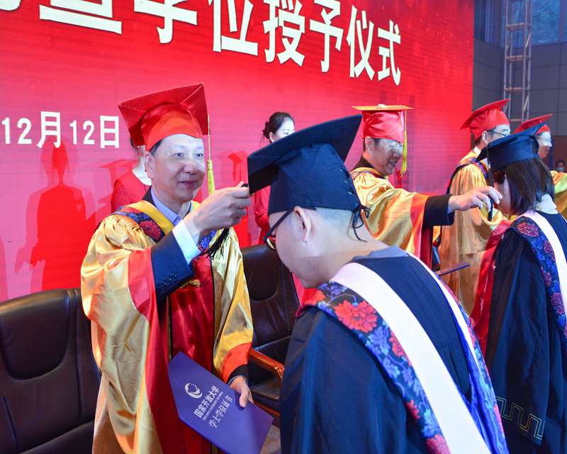 党委书记陈兴炎为学生颁发学士学位证书并拨穗
