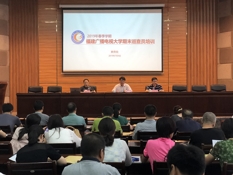 7月4日下午,全省2019年春季期末考试巡查工作培训会在桂山校区召开,副校长陈展虹出席会议。各包片处级干部、全省电大系统抽调的巡查人员、巡视员及网络舆情监控员90余人参加会议,教务处处长李正光主持会议。